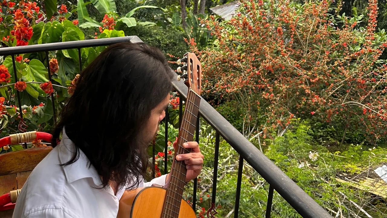 Med sin gitarr blandar Nicolas klassiskt gitarrspel med sydamerikansk folkmusik.
